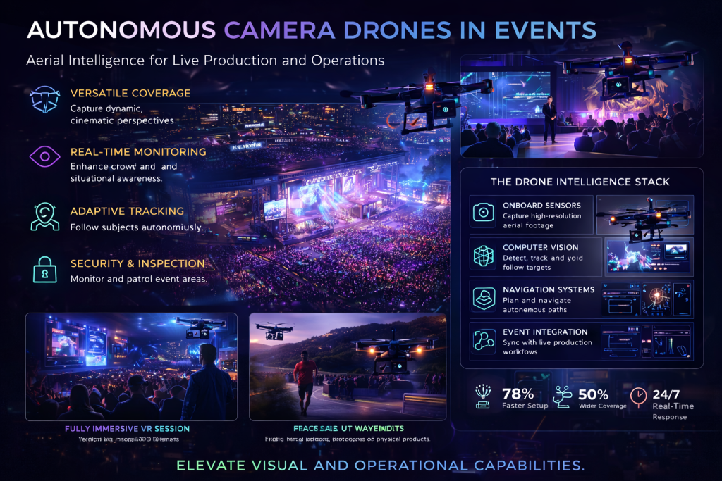 Autonomous camera drones are evolving from specialized tools into integral components of event infrastructure. They extend the capabilities of both production and operations, providing mobility, intelligence, and real-time responsiveness.
