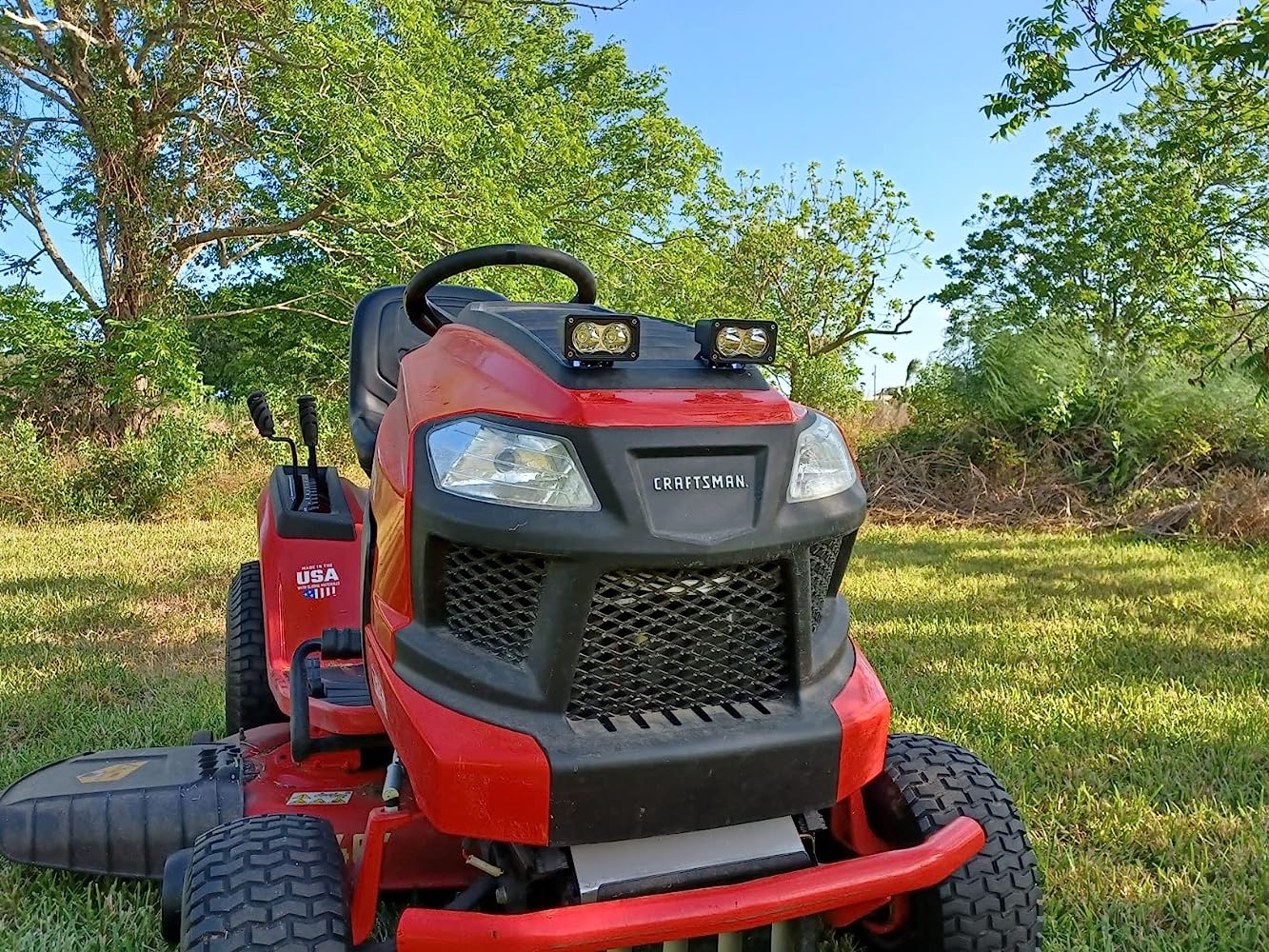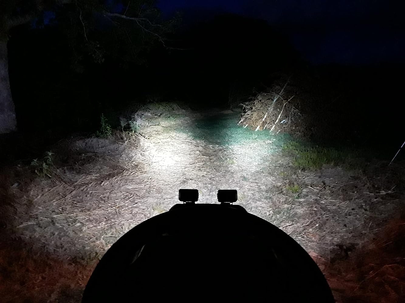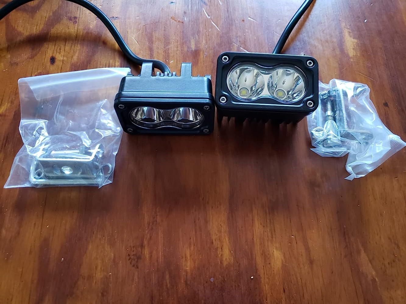 In the box, you’ll find mounting brackets and a complete hardware set to mount these two small fixtures. Mounting and wiring is easy, takes about 10 minutes. The stock lights on my lawn tractor leave a lot to be desired so it was time for a basic improvement! Now I can navigate my acres of overgrown yard with some certainty as to where I’m going.Compact but very bright, these lights do not get more than warm to the touch. The beam is quite narrow/tight and has quite a long range (see photo progression) These fixtures would work very well on a motorcycle or car too. I’m still shocked at how bright they really are! The photos do not do them justice. An excellent value for sure, the manufacturing quality is obviously top notch.I’m very happy with these spot lights on my lawn tractor and will soon install a set on my van. They would be excellent on the highway…those unlit roads between cities, you know?