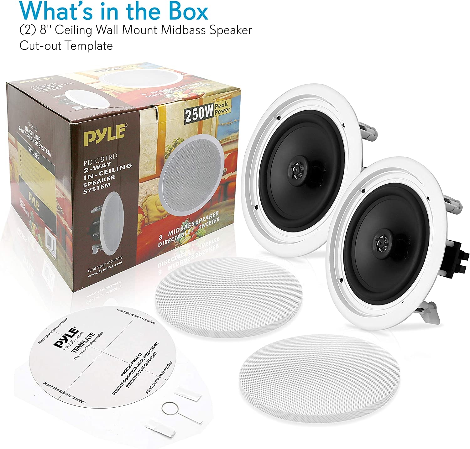 They look and sound great – Looks like a professional install. A++++++These 8″ Pyle speakers look great and sound wonderful.First the speakers arrived very quickly and with no damage whatsoever. We will be ordering more to complete our whole house project.What’s in the box:In each box you will find two speakers with grillsInstructions / installation bookletAdhesive pads if needed to re-attach the grill**Installation Tip** I had a hard time figuring how to remove the grill without bending it all to pieces. Simply flip the speaker over on your lap (you will be looking at the magnet side of the speaker). Flip out all of the plastic clips that holds it to the ceiling. Once you flip them out press down on them one at a time while holding the speaker up and the screws will drop down and push the grill out.We started with our surround sound in the living room. We installed the front surround speakers in the ceiling and with the adjustable tweeter it worked well for us. We also used these for the back speakers behind our seating area.For the installation of each, I knew approximately where I wanted the speakers so I used the old “knock and listen” technique to locate a joist. I found where I thought was the center and I drove a small nail into the ceiling (in case I was wrong I wouldn’t have a large screw or nail hole in my ceiling). I then pushed a thin piece of wire through the hole and then went into the attic to check my spacing between the joists. Once I located the center between the joists I measured from each wall to my small hole to make sure my other speaker lined up perfectly with this one.I took the piece of wire out of the ceiling and pushed it through the center of my template and then place the wire back through the hole on the ceiling. I marked around the template with a pencil and then cut out my circle. The speakers all slipped right into place, I tightened the screws, replaced the grill, ran my wires and hooked them all up and we now have surround sound in our ceiling.**Installation Tip 2** The first hole I cut on the inside of the line just in case the template was too large but for the other three I cut right on the line with a manual drywall saw and they fit perfectly. Just take your time and don’t rush the job and you will have outstanding results.We’re very pleased with the look. I’ve seen where some people painted theirs in order to have them blend into the ceiling but you really don’t notice ours and even if someone does, they look nice and look professionally installed. Like I said before we will be buying more to complete our whole house speaker system including a set of outdoor speakers on the front and back of the house and I will definitely use Pyle, you can’t beat the price.