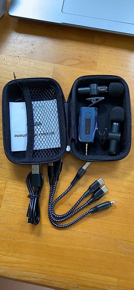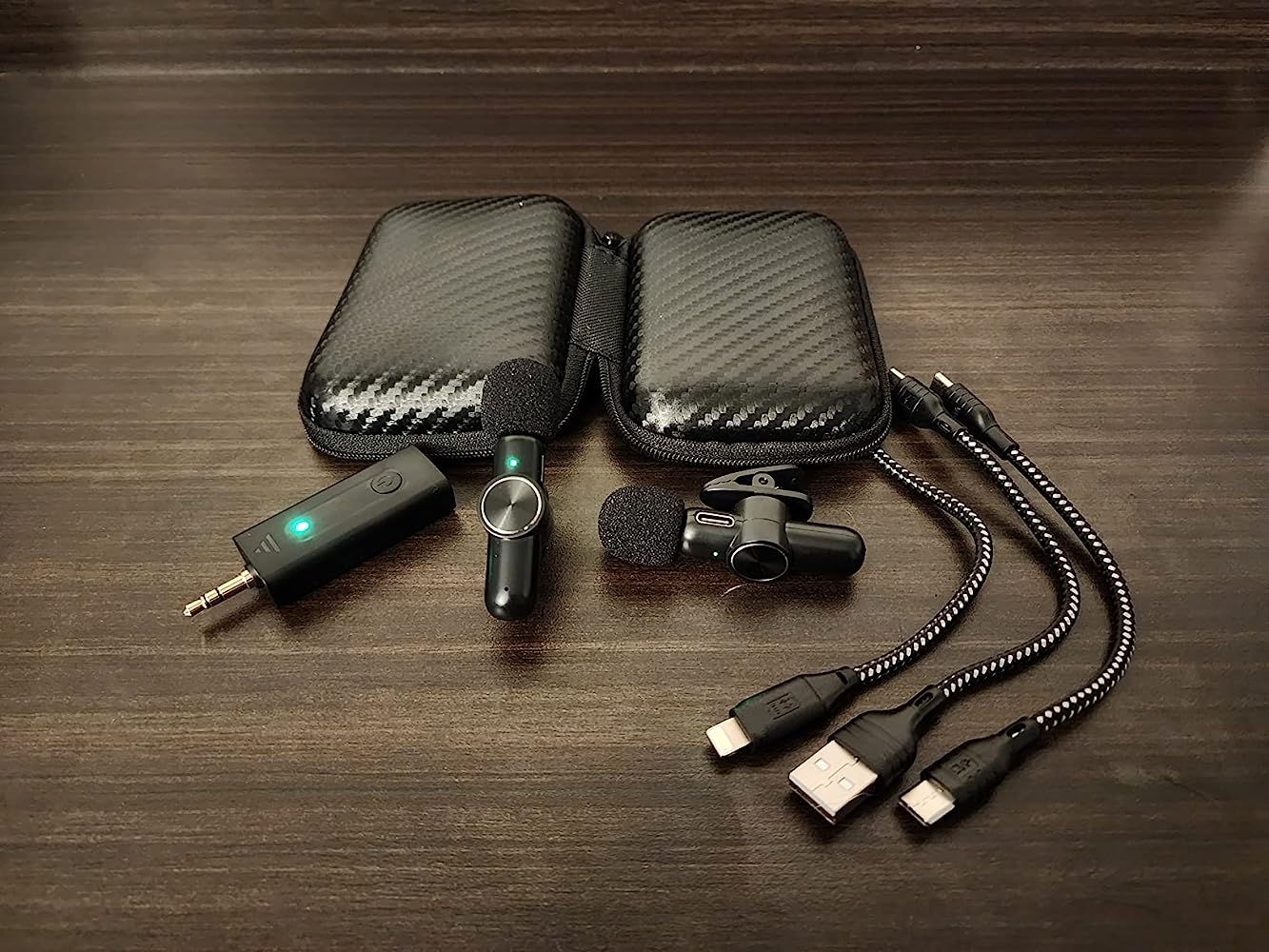 I used this microphone with my phone (Samsung Galaxy S22 Ultra) and with my computer (Surface Pro 5).The receiver connects to both devices using USB. My phone doesn’t have a headphone port, so this option (and the included USB C to C cable) made connecting the receiver as simple as possible. The receiver automatically connects to both microphones when they’re powered on (as shown in the photo – even when not connected to another device, they connect to each other automatically).While connected to my phone, I used the microphone to record audio. The audio from the microphone had a slightly more crisp quality and picked up noticeably less background noise than the built-in microphone on my phone.While connected to my computer, I used the microphone to communicate via apps like Discord and Zoom. As with the audio on my phone, the people I was connected with told me there was significantly less background noise. While the microphone was initially too quiet (they told me I sounded distant at first) turning up my input volume from 80% to 90% resolved the issues instantly.The microphone comes with a sleek black carrying case that can hold the receiver and both microphones, as well as the cables that come with the device. One side of the case has netting on the interior, perfect for protecting the microphones.The included cables are USB C to C, USB A to C, and USB C to Lightning for Apple users. The cables all seem to be well-built, with a braided cover that feels and looks high-quality. Where the cables meet the ends are reinforced plastic guards that protect against wear.The cables are about 6 inches long, so if you need something longer, be prepared to buy it separately. The length of these cables suit my needs just fine, though.