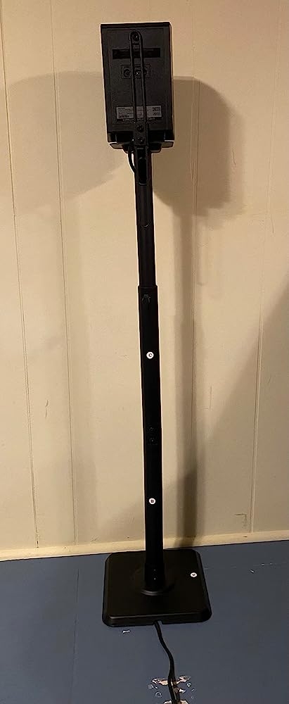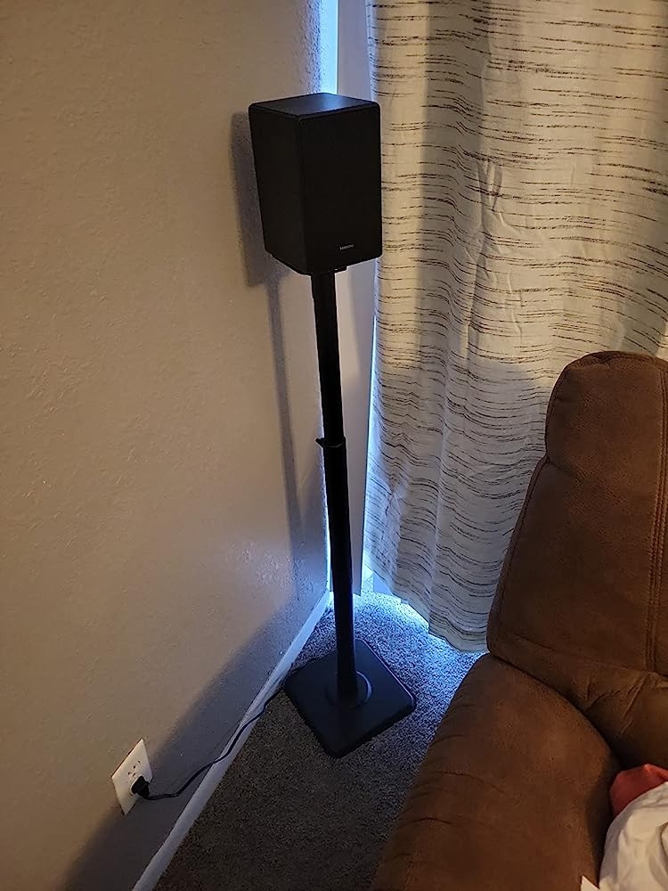 Sturdy design. Easy to assemble and easy to adjust the height. Great for my Samsung Q990B rear surround speakers. Good solid base with internal wiring options. Was able to use original power speaker cords. Purchased the longer 12ft cords on Amazon to replace the original cords but they were too big. The original cords which plug into the speaker are 30mm wide. The replacements were 35mm and would not fit through the middle tube. Make sure your get cords that fit. Very happy with the stands and recommend them for small speakers.