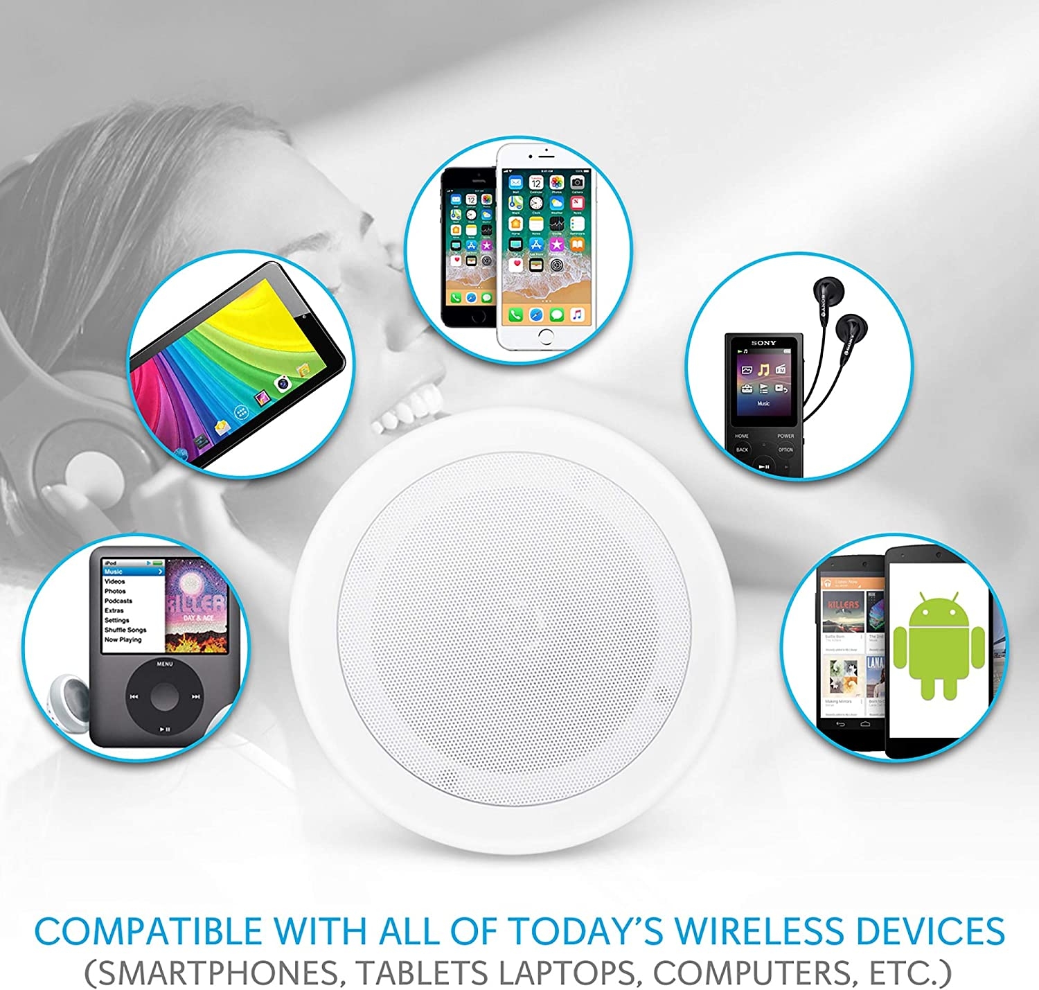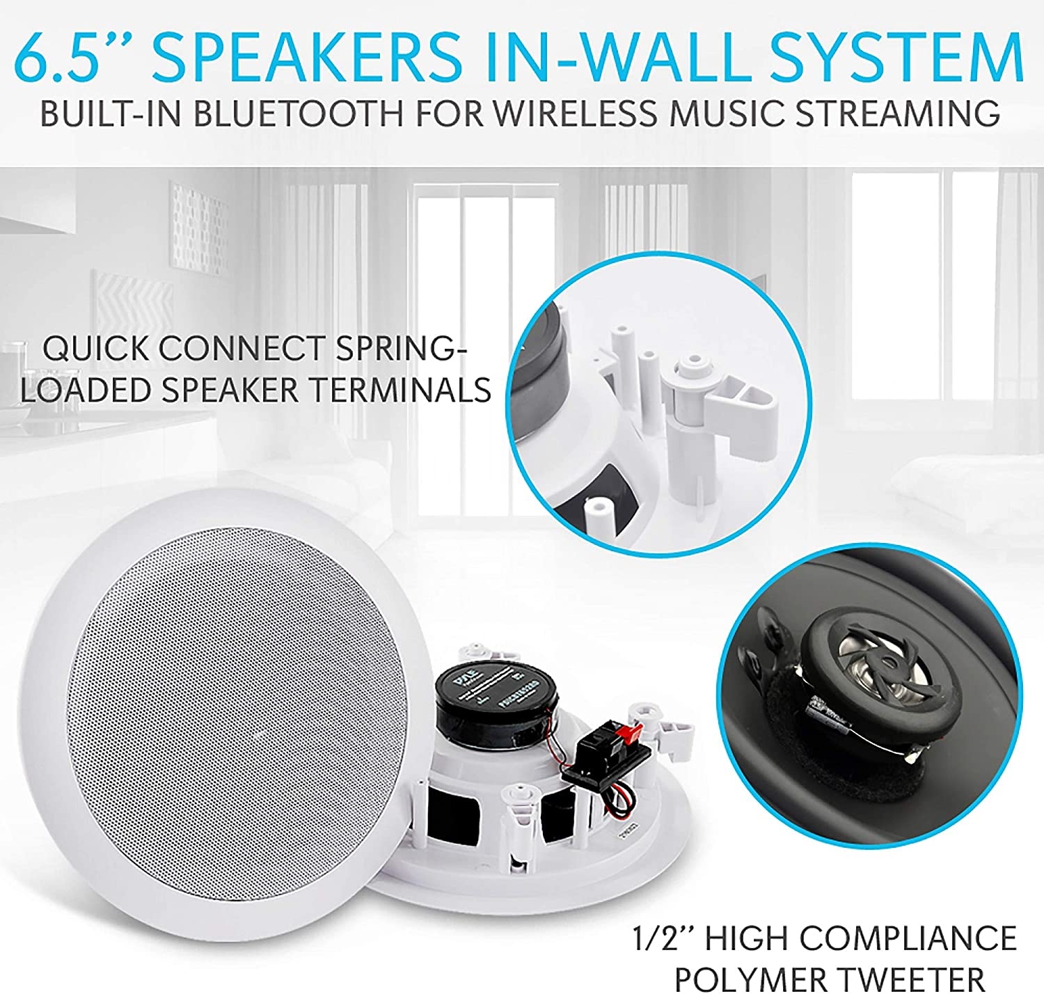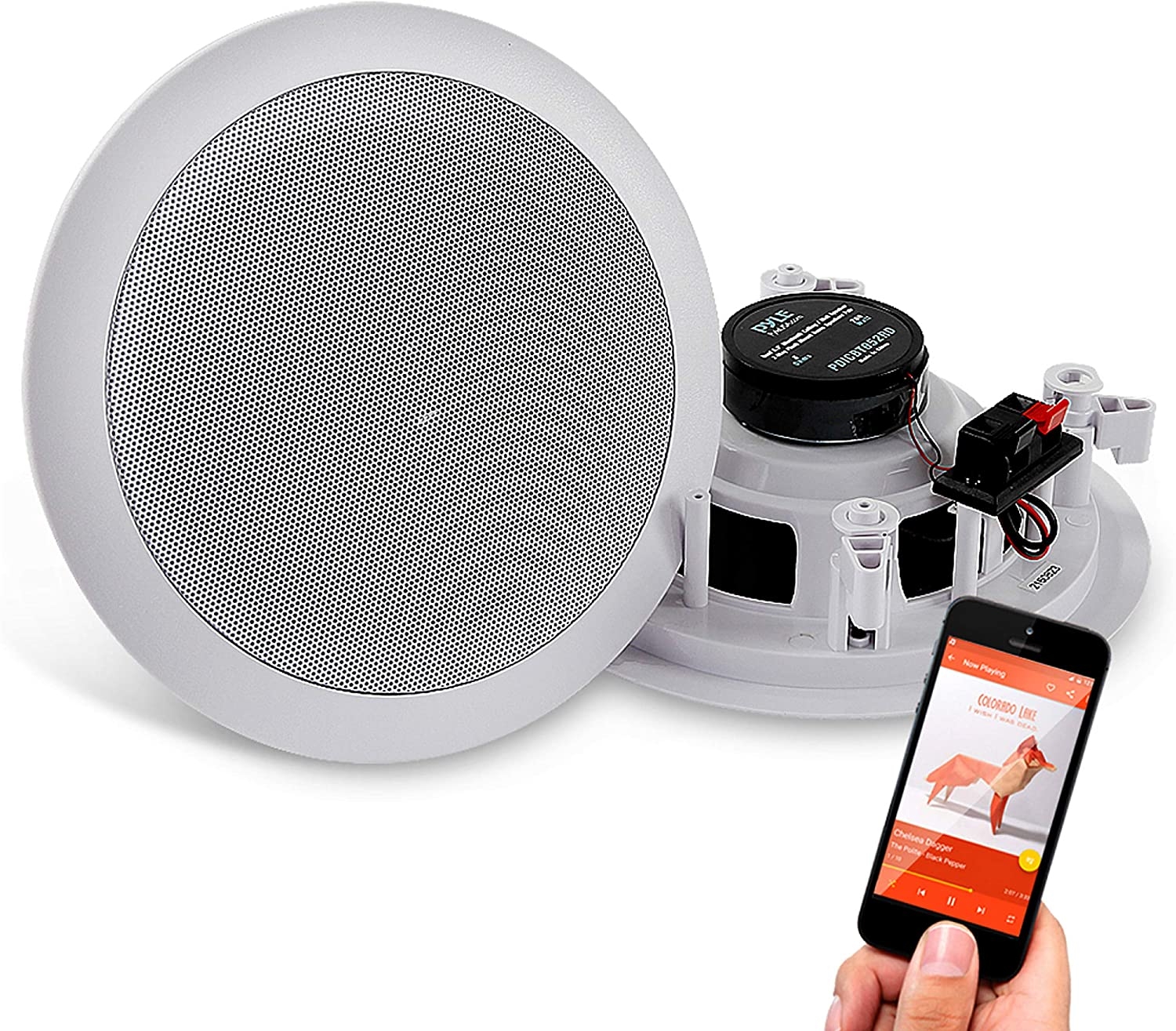 Pyle Model : PDICBT652RD6.5″ Bluetooth Home Ceiling SpeakersDual 6.5’’ Bluetooth Ceiling/Wall Speakers, 2-Way Flush Mount Home Speaker Pair, 200 Watt Features:Includes (2) 6.5’’ -inch SpeakersIn-Wall/In-Ceiling SystemBuilt-in Bluetooth for Wireless Music StreamingQuick Connect Spring-Loaded Speaker Terminals1/2’’ High Compliance Polymer TweeterPolypropylene Cone with Rubber EdgeMounts Flush to Walls or CeilingsCut-Out Size Template for Easy InstallationPerfect for Custom Installations & ApplicationsBluetooth Connectivity:Includes Bluetooth Wireless Audio Control ReceiverWorks with All of Today’s Latest Devices (Smartphone, Tablet, Laptop, Computer, etc.)Bluetooth Network Name: ‘Pyle’Bluetooth Network Password: ‘0000’ (4 Zeroes)Bluetooth Version: 4.0Wireless Range: 30’+ ft. What’s in the Box:(2) 6.5’’ SpeakersSpeaker Connection WireBluetooth Control ReceiverPower SupplyTechnical Specs:MAX Power Output: 200 WattImpedance: 8 OhmSensitivity: 88 dBFrequency Response: 70Hz-20kHzPower: 100/240V (12V DC Power Supply)Total Unit Dimensions (Diameter x Depth): 9.0’’ x 3.1’’Cutout Diameter: 7.6’’, Cutout Mounting Depth: 2.8’’Single Speaker Weight: 3.3 lbs.The Pyle In-Wall/Ceiling Bluetooth Speaker Kit delivers effortless stereo sound to any room in your home or office. The included Bluetooth controller allows for wireless music streaming ability and doubles as a sound processing digital amplifier. You will be able to stream audio from all of your favorite Bluetooth devices (like smartphones, tablets and computers). Each round-style speaker features a high-compliance polymer tweeter that delivers full, rich sound without cluttering floor space. They include a cut-out template for easy installation. Mount them in a convenient location on the wall or ceiling for a flush, clean look. Achieve wide-range sound performance and add audio to any room with the Pyle In-Wall/Ceiling Bluetooth Speaker Kit.