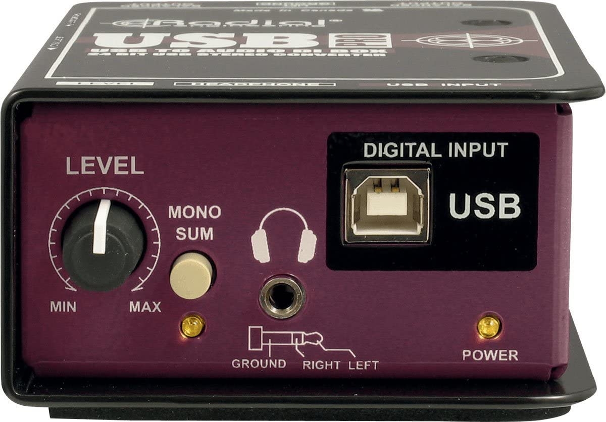 USB-Pro Stereo USB Laptop DI. “The Radial USB-Pro is a high-resolution stereo direct box designed to convert sound files from a laptop computer and seamlessly transfer them to a pair of balanced audio outputs to feed a PA, recording or broadcast mixing console. The USB-Pro automatically configures itself for use with all popular operating systems including Mac OSX, Windows XP, Vista and Windows 7, thus eliminating the need to load special drivers. Unlike devices that are limited with 16 bit, 44.1kHz conversion rates, the USB-Pro elevates the performance with true 24 bit, 96kHz stereo converters to deliver more headroom and greater detail. This eliminates the need for additional sound cards or separate converters when transferring files, further streamlining production in busy work environments. Connection from the laptop is done via the ‘pro-audio standard ‘ USB type-B port. Digital-to-analog conversion is monitored with the built-in headphone amplifier to ensure the signal is being properly downloaded and converted. A mono-sum switch may be engaged to check for phasing or facilitate signal distribution to two outputs should this be preferred. One simply sets the output volume control to suit. Should hum or buzz caused by ground loops be encountered, two ‘set & forget’ side-access switches let you insert isolation transformers into the signal path to block stray DC voltage offsets. To further reduce susceptibility to noise, this is augmented with a ground lift switch that lifts pin-1 on the two XLRs. As with all Radial products, the USB-Pro is designed to handle the rigors of professional touring. The unique book-end design creates protective zones around the switches, connectors and controls to keep them out of harm’s way. Inside, Radial’s time-tested I-beam construction assures the sensitive internal PC board will not torque which could otherwise cause premature part failure. Finally, a full bottom no-slip pad provides mechanical isolation and electrical insula…