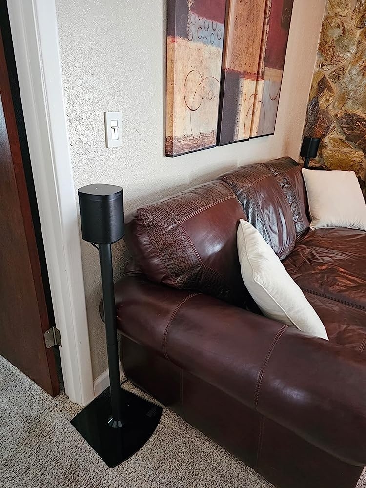 I had previously bought the Sanus Sonos speaker stands and can honestly say that those feel more sturdy than this brand. The biggest drawback with this brand is that the support post consists of two pieces held “together” by a plastic tube that fits between the two posts. I don’t understand why they chose this design since the plastic tube doesn’t really hold the posts together–you don’t screw the two posts unto the plastic tube, you simply pop the two posts unto each end of the plastic tube. When I was moving the stand from one place to another, I grabbed it from the top of the post, which easily separated from the bottom post connected to the tempered glass base. I had to keep reminding myself to grab it from the bottom post everytime I needed to move the stand. By contrast, the Sanus stand consists of one long support post which screws unto the base and the speaker–so when I move the stand around I simply grab it from the post without fear of the speaker falling off or the post separating from the base. As others have mentioned, the speaker is not screwed unto this post, it simply slides into place. If I had to purchase another set of stands, I’d buy the Sanus brand though.