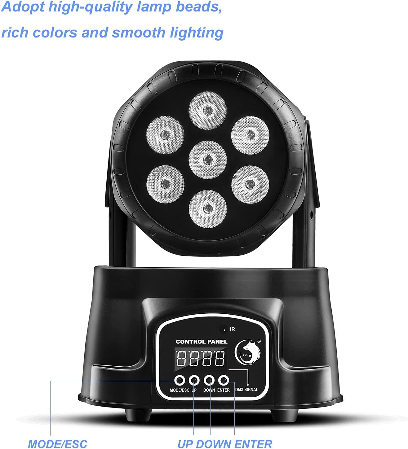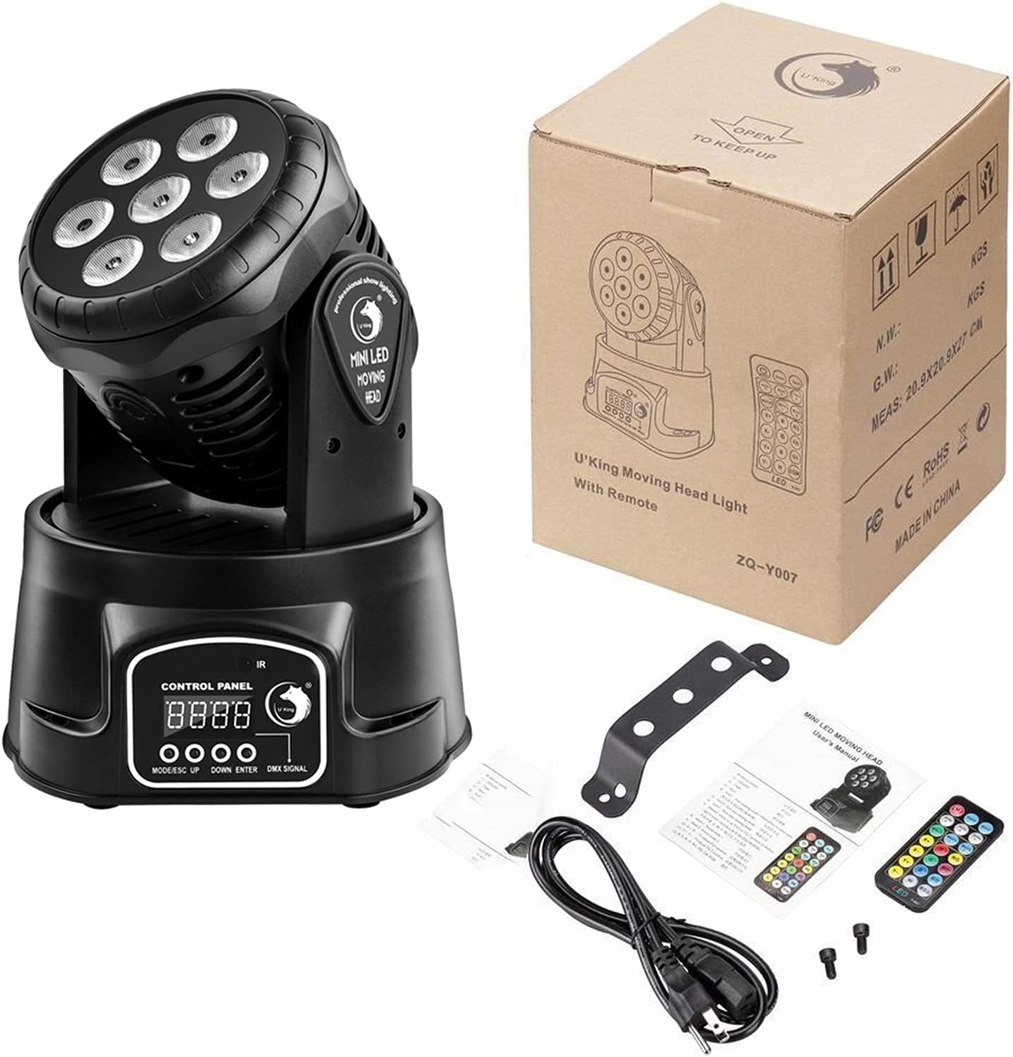 The U`King Moving Head Light B-136 is a powerful and flexible professional stage lighting fixture that can be used for a wide variety of applications. It harnesses the power of an efficient 10-Watt RGBW (red, green, blue and white) LED light source, which generates a potent and even output with no color shadows. This efficient light engine combines red, green, blue and white LED chips to allow the creation of a huge gamut of colors. Offering a wide beam angle, allowing a large area to be washed with vibrant colored light.