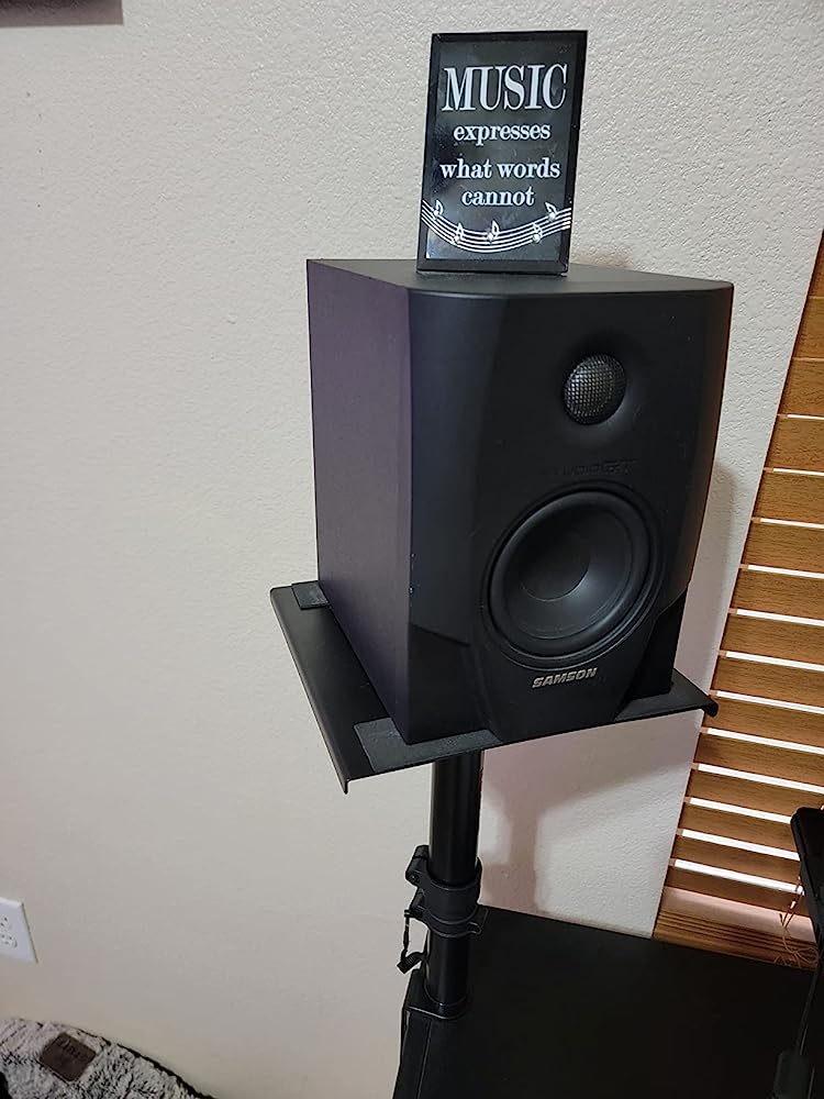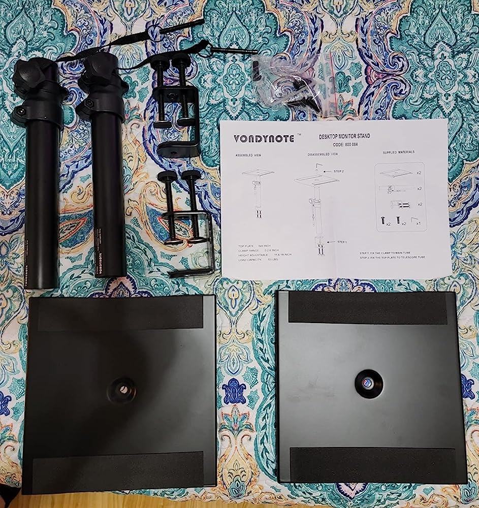 DO NOT BUY if you want to clamp this to your home desk, unless your desk is at least 1 foot away from the wall. I got this for my new bookshelf speakers I got for my PC setup, but can’t use because my desk is right next to the wall so I can’t actually attach the plate to the stands themselves. Just no space. It seems very sturdy, and is easy to build but returning because I can’t use it.Suitable for people who have more space between the wall and desk, or for holding monitor speakers in a studio or dj setup.